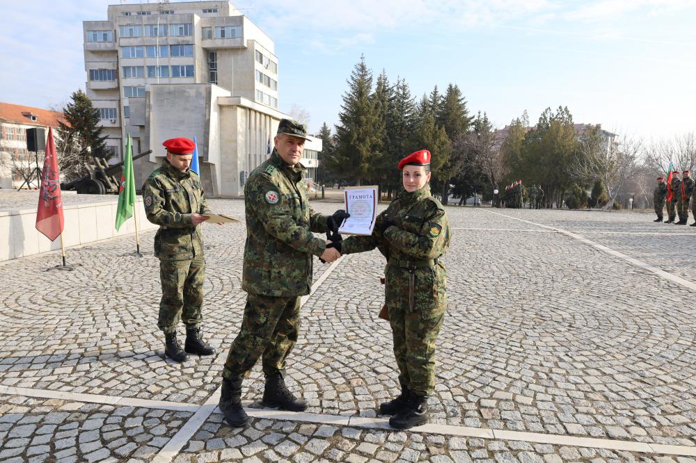 Днес, 14 февруари, в района на 5-то бригадно командване в град Плевен, се проведе ритуал по тържествено връчване на удостоверенията на новоназначени военнослужещи във формированията на Сухопътните войски, завършили успешно обучението си в модул „Начална военна подготовка“.