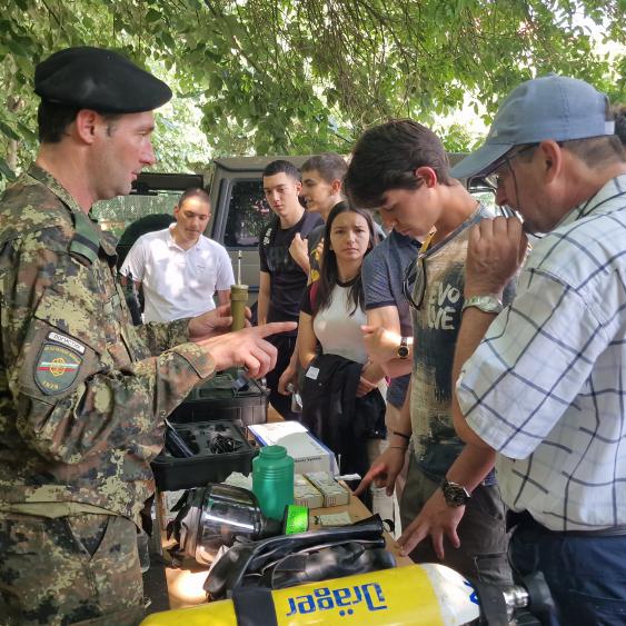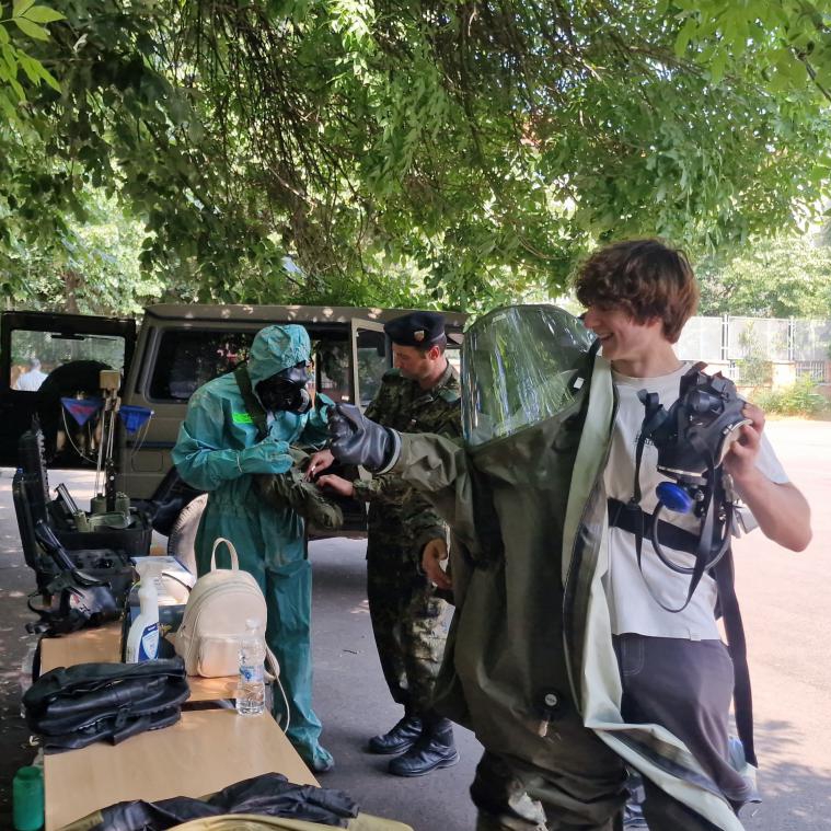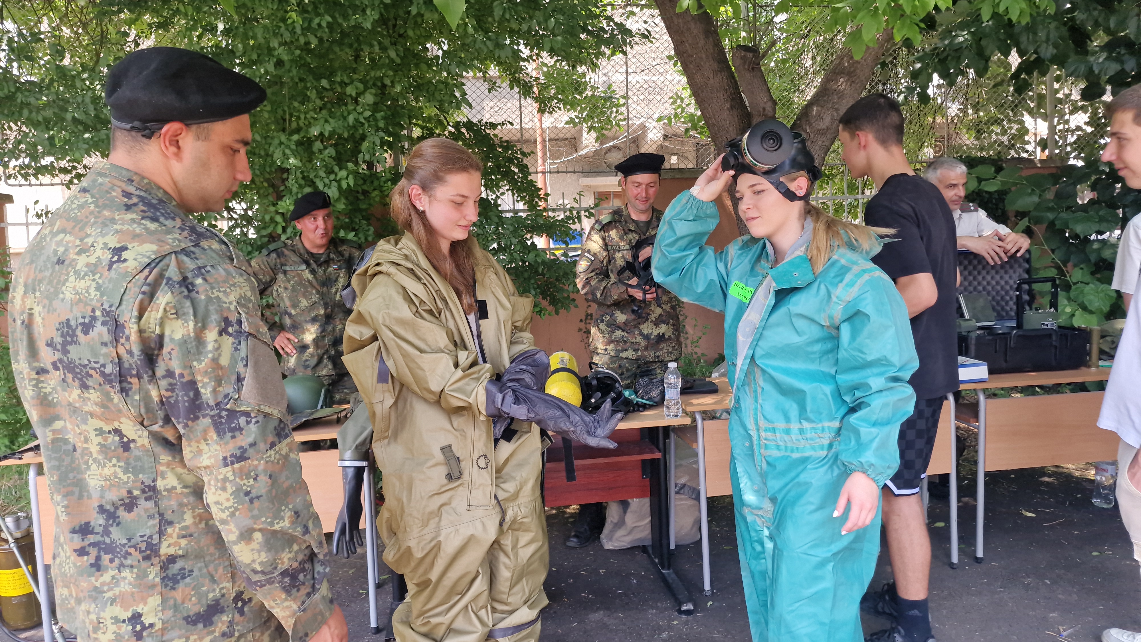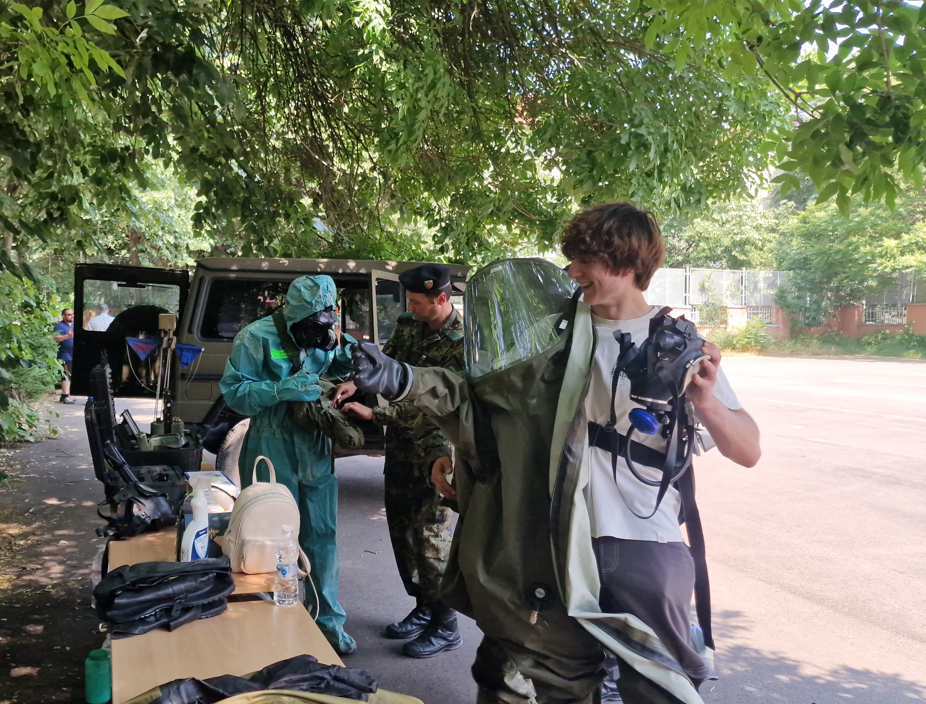 Под ръководството на старши сержант Антон Иванов учениците обличаха защитните средства и костюми, работеха с приборите за разузнаване и извършваха пробовземане, като химици от Сухопътните войски.