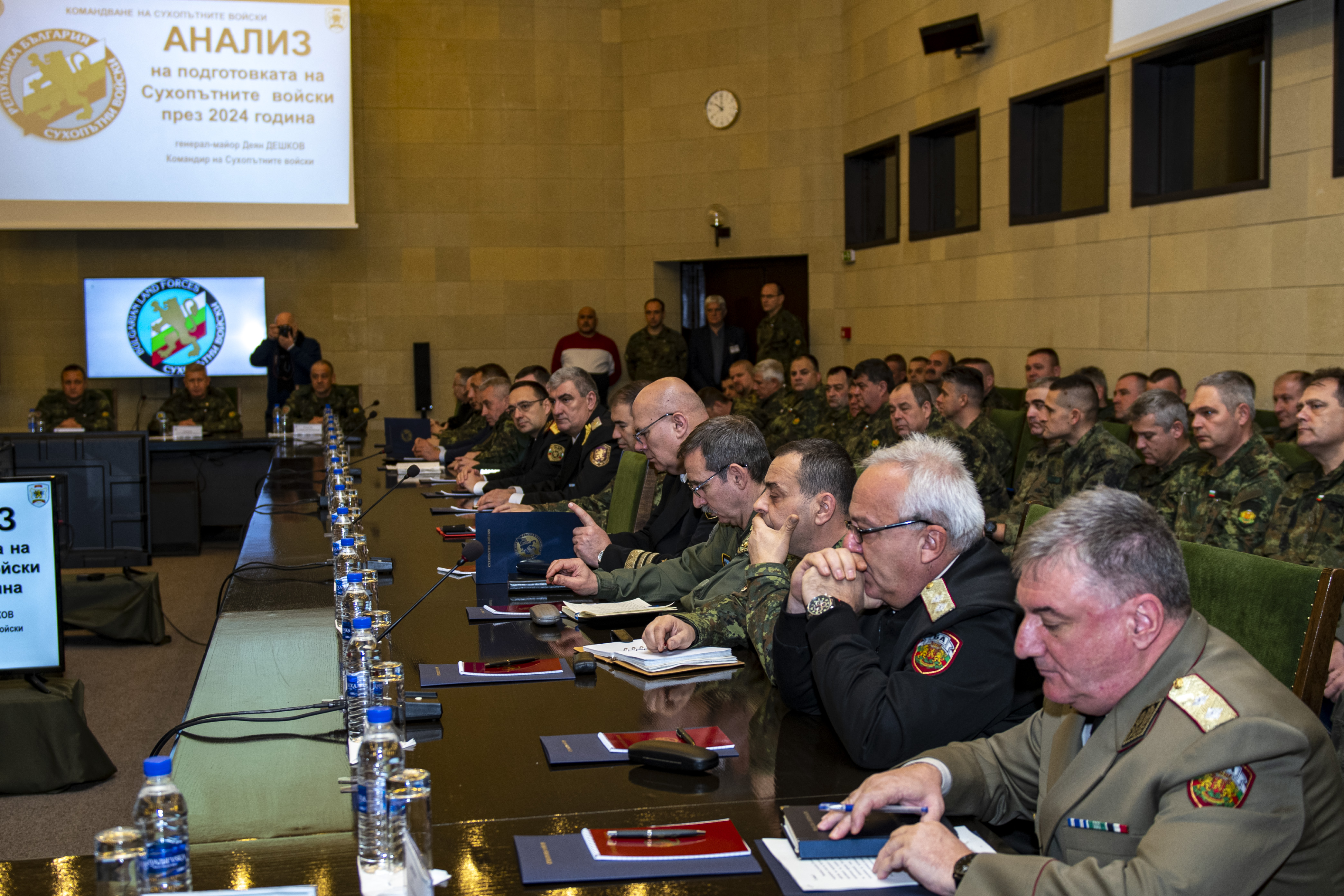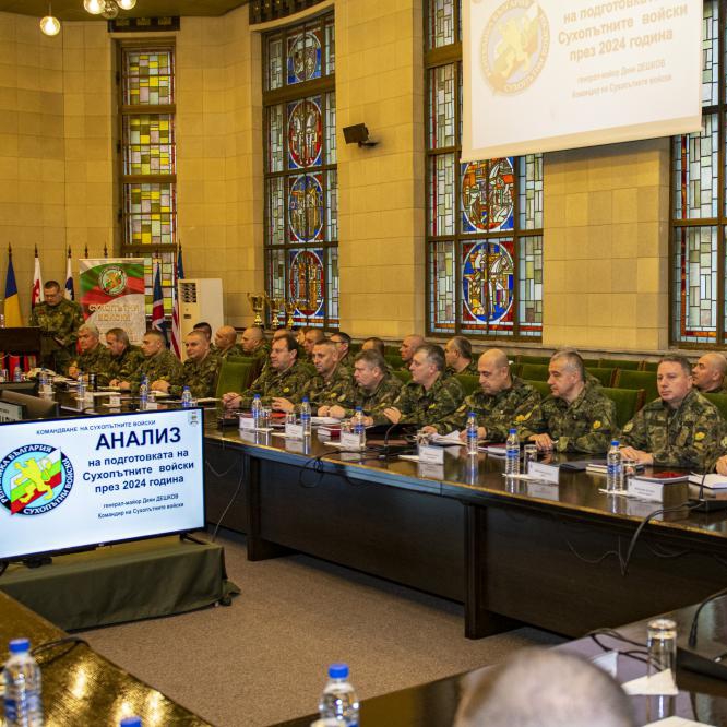 Днес, 22 януари, в присъствието на началника на отбраната адмирал Емил Ефтимов, директора на щаба на отбраната, началника на ВА „Г. С. Раковски“, директора на служба „Военна полиция“, командирите на Съвместното командване на силите и видовете въоръжени сили, представители на Съвместното командване на специалните операции, командването за логистична поддръжка, ръководството, началниците на отдели от командването на Сухопътните войски и командирите и главните сержанти на военни формирования бе проведен Анализ на подготовката на Сухопътните войски през учебната 2024 г.